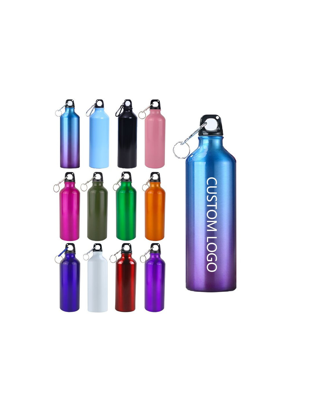Practical design Featuring recyclable aluminum and a carabiner to hook onto any bag, this custom bottle is perfect for traveling, commuting and more. Plus, it’s a great way to stay hydrated on the move. If you're looking for a smaller bottle, this one is also available in 17 oz.